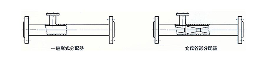 適用于二股或二股以上流體進料,當(dāng)主流與次流壓力不平衡時選用文氏管形分配器, 當(dāng)主流與次流壓力平衡時選用一般形式分配器。